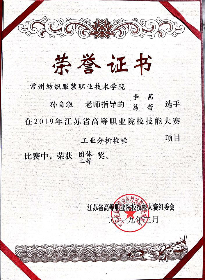 3月8日,2019年江苏省高等职业院校“富美家杯”工业分析检验技能大赛在南京科技职业学院拉开帷幕。参与本次赛项的62名选手来自全省31所高职院校,比赛内容包括理论知识与仿真操作考核、化学与仪器分析操作考核,竞争激烈。经过2天的赛项角逐,纺织学院的李茜和葛蕾两位同学脱颖而出,获得了团体二等奖的优异成绩,是常州大学城三所参赛院校中的最好成绩。曹怀宝、孙自淑两位老师均获得了优秀指导老师奖。