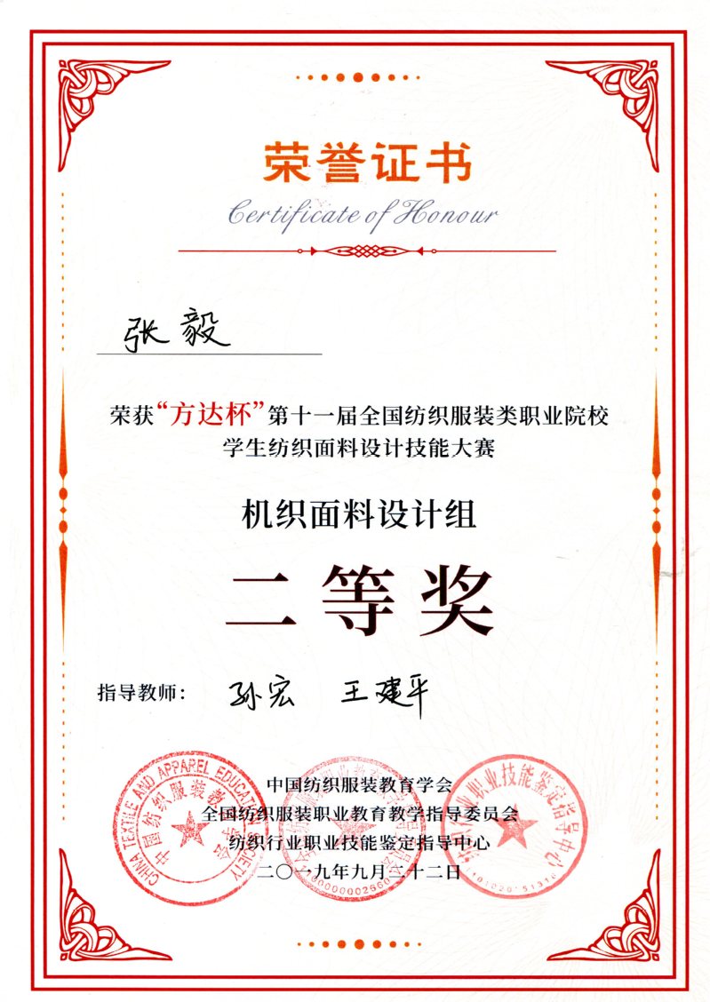 来自15所院校共计54名选手参加了机织面料设计项目比赛,赛项评奖主要从理论、作品的创新性、实用性、市场潜力等方面进行综合评价。纺织学院纺设1731车天晴、纺设1831张毅、纺设1831雷滨滨、纺设1831张亚芹、纺检183B胡芳芳五位同学在创新创意设计方面表现突出,共获得二等奖1项,三等奖2项,优秀奖3项,其中一年级学生张毅首次参加面料技能大赛就获得了二等奖的好成绩。
