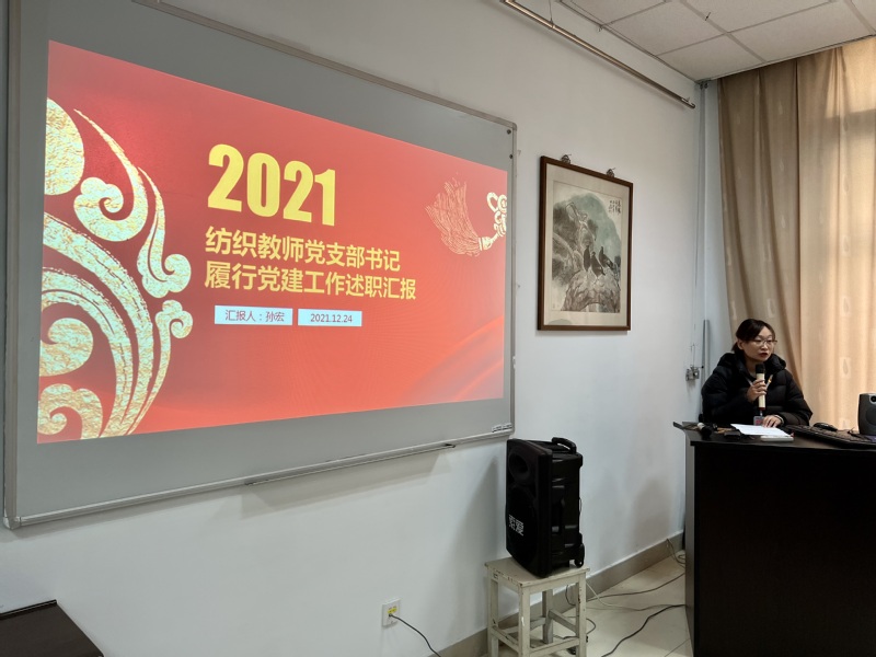 为深入贯彻落实习近平新时代中国特色社会主义思想和党的十九大精神,坚持和加强党的全面领导,进一步推进党支部工作的标准化、规范化,充分发挥党支部战斗堡垒作用,为学校事业的进一步发展提供坚强保证,12月24日上午,纺织学院党总支在4B306召开2021年度基层党支部书记履行党建工作责任述职会议,会议邀请了常州大学石油工程学院党委书记王永利、常州工程职业技术学院继教院国教院党支部书记、院长窦苏明、常州旭荣针织印染有限公司党支部书记、副总经理张国成作为评审专家,纺织学院三个党支部书记进行了现场述职,会议由纺织学院党总支书记高妍主持,全体党总支委员及党员代表参加了评议。