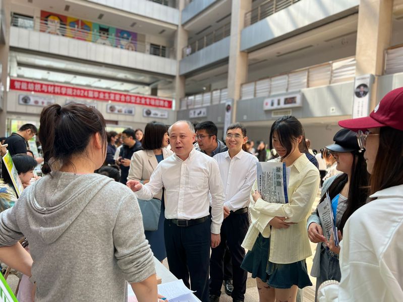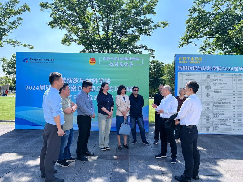 为深入贯彻习近平总书记关于高校毕业生就业工作的重要指示精神,认真落实江苏省和学校党委关于毕业生就业工作的决策部署,深入推进校企合作、产教融合,促进教育链、人才链与产业链、创新链精准对接,助力地方经济社会和行业企业发展,推动学院大二学生顶岗实习工作和2024年毕业生高质量充分就业。智能纺织与材料学院将于5月8日下午在文化传承与创新中心一楼举办2024年紧密合作型企业专场招聘会。校党委书记吴访升、校党委委员、副校长张震宇、招生就业处处长高妍深入招聘会进行指导交流。智能纺织与材料学院全体党政领导及各专业老师到场参会。
